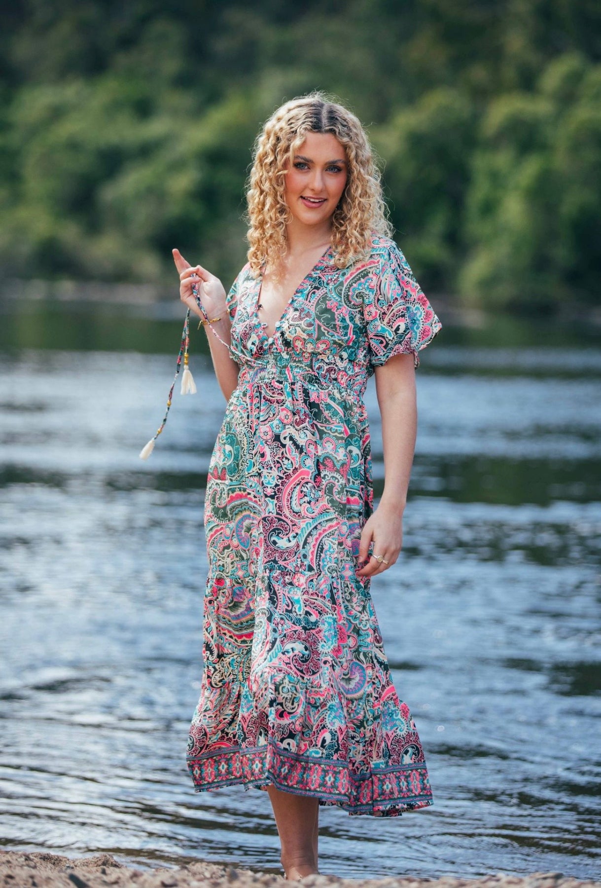She features a button through neckline, a floaty midi length, a comfy elasticised and adjustable waist and floaty cap sleeves.