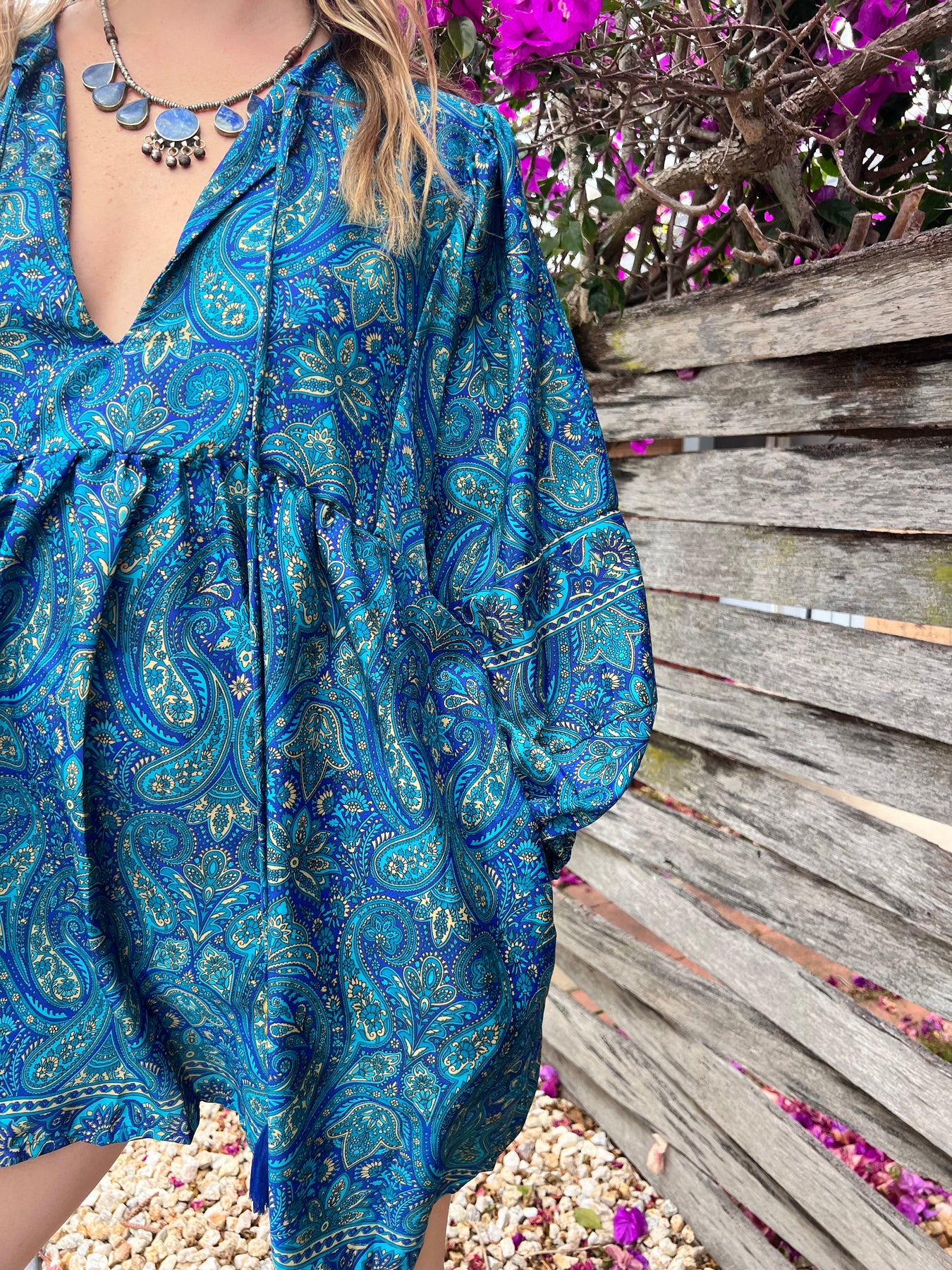 Get ready to make a statement with the one size fits all, silk Juno blouse. A style that sits somewhere in between a top and a dress, depending on you how choose to style it.